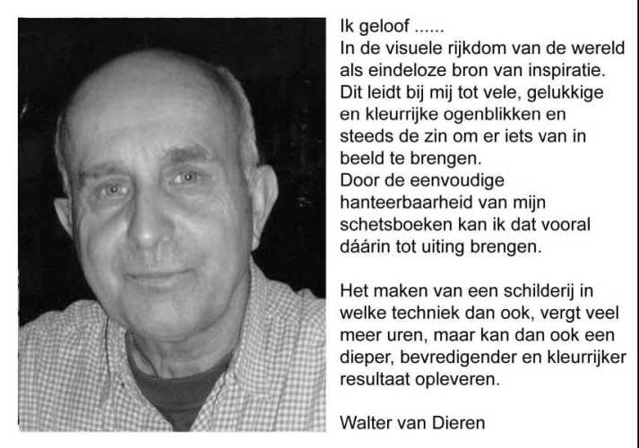 Walter van Dieren een kunstenaar in hart en ziel. Vanaf zijn jeugd is hij bezig met schilderen. Nu hij een heel leven als schilder/liefhebber van kunst achter de rug heeft, is voor Walter van Dieren eindelijk de tijd aangebroken om zijn werken aan een groter publiek ten toon te spreiden.