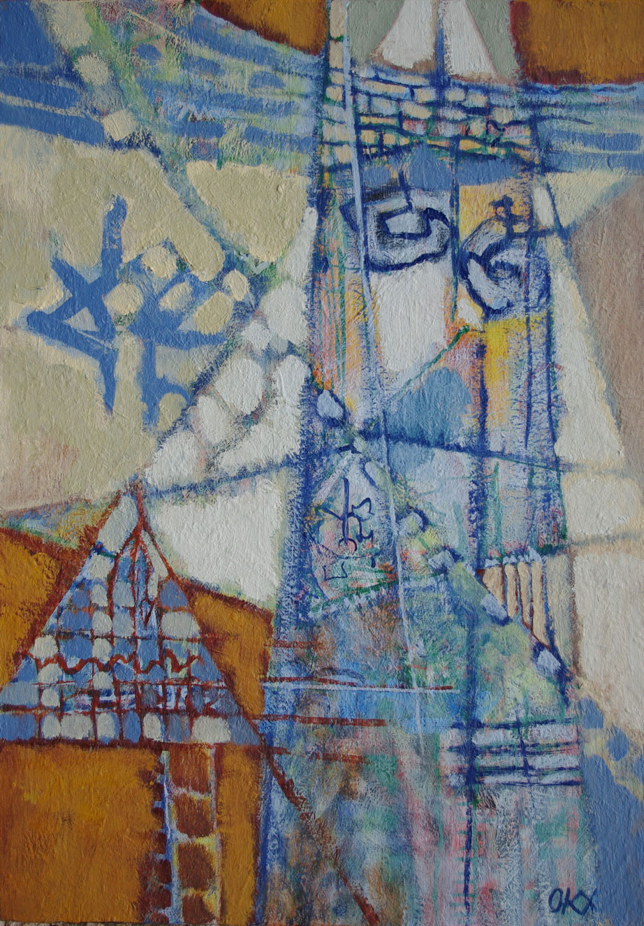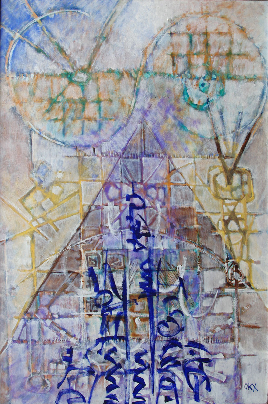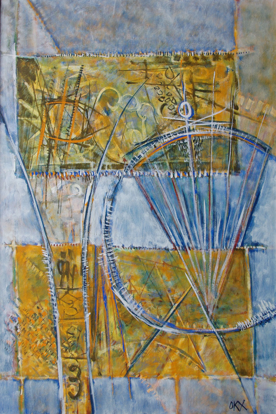 Kees Okx (1939-2015) is vanaf zijn 17e tot op zijn 75 jarige leeftijd bezeten geweest van tekenen, etsen en schilderen. In de loop van al die tussenliggende jaren heeft Kees een geheel eigen abstracte stijl ontwikkeld, waarmee hij internationale bekendheid verwierf. Zijn werk is in veel landen te zien door aankopen van musea, maar ook door vele exposities o.a. in New York, Bremen, Kopenhagen, Parijs, Jeruzalem, Tunis en Palo Alto (VS). Okx kan beschouwd worden als een lyrische schilder die vanuit een mystiek gevoel tot schilderen werd gedreven. Ooit zei hij hier zelf over: “schilderen is voor mij een magisch gebeuren, waarbij ik mij een voel met de verf, met de natuur en misschien wel met het hele universum, het lijkt alsof er een soort herkenning is met iets dat al heel oud is en mij bekend voorkomt”. Het jaar 1969 kan worden beschouwd als een doorbraak van Kees Okx: hij exposeerde met het thema ”Het Labyrinth” achtereenvolgens in het Stedelijk Museum in Amsterdam , het Stedelijk Museum in Schiedam en in de Haarlemse Vishal. In zijn ruimtelijke wereld van tekens en symbolen kwamen muziek, poezie en beweging bij elkaar. Het waren spraakmakende performances, happenings die aardig wat stof deden opwaaien.