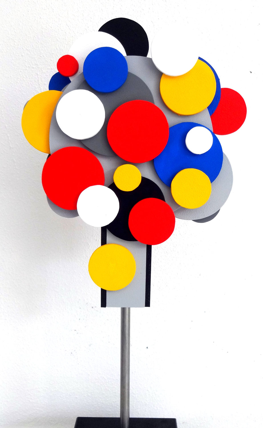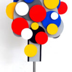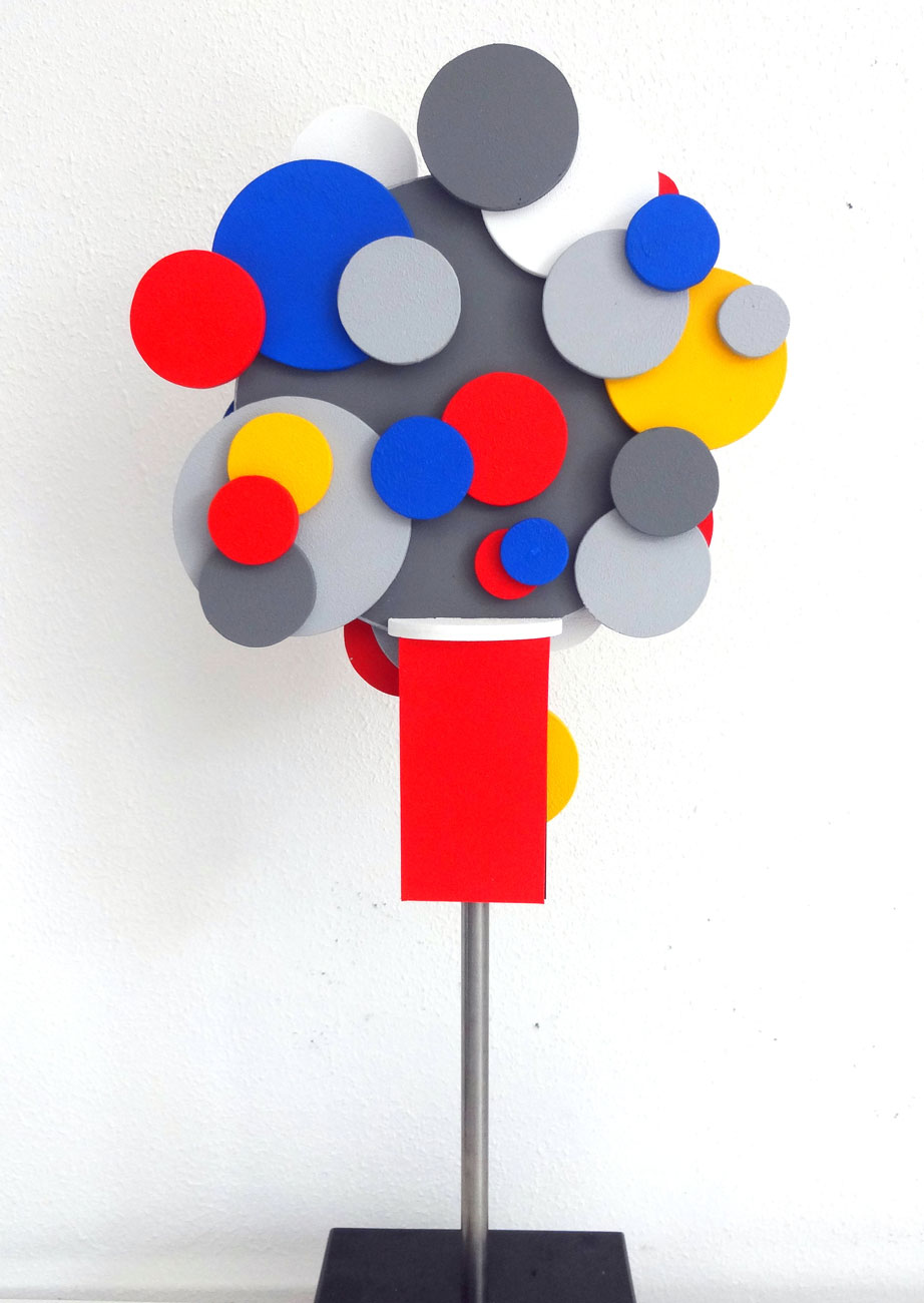 De in Friesland wonende beeldend kunstenaar Theo Schouten (Haarlemmer in al z’n genen) verraste een aantal jaren geleden met intrigerend werk opgebouwd uit geometrische vormen, structuren en lijnen. Beslist nog in de 2-dimensionale traditie, maar met een eerste, weliswaar voorzichtige, vingerwijzing naar meer diepte in het werk. Uitgevoerd in primaire kleuren op papier en linnen, met hier en daar verrassende insnijdingen en opdikkingen teneinde licht, donker en schaduwwerking z’n natuurlijke werking te laten doen. Maar de ontwikkeling staat bij Theo niet stil: recentelijk is hij gestart met het werken met kunststof. En met een totale verbanning van lijsten om zijn werk. Zoals hij zelf treffend onder woorden brengt: ik ben nu verlost van de dwang van het vierkant. Want het kader bepaalt niet meer de maatvoering maar datgene wat ik wil scheppen, de inhoud, het werk zelf! Theo omschrijft z’n werk zelf als driedimensionale abstracte geometrische belevingen.