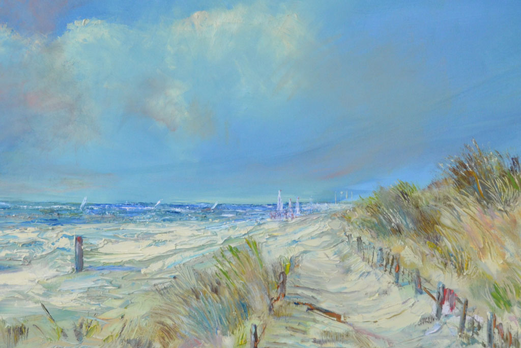 Landschappelijk werk noemt Ad zijn schilderijen. Voor Ad een breed begrip waar niet alleen strand, bomen en duinen deel van uitmaken maar ook zee en lucht. In deze tentoonstelling toont Ad vooral werken met als onderwerp: de zeekust. Zoals Ad het zelf onder woorden brengt: het observeren van de zee, de duinen, de gehele zeekust, geven mij een geweldig gevoel van vrijheid. Aan de zeekust treft mij vooral de diepte en het licht, de alsmaar wisselende kleuren en schaduwen op die plekken tracht ik dan ook vast te leggen met mijn schetspotlood en penseel. De ruimte en de wisselingen van het licht zijn elke dag zo boeiend en oneindig. Het is voor mij een uitdaging om dit beeld vast te leggen op het doek.