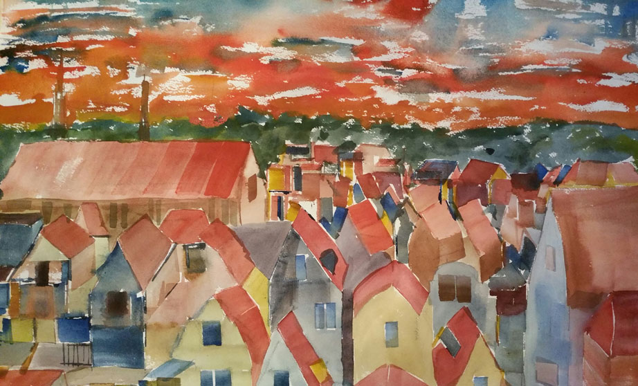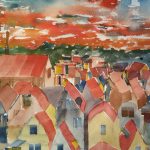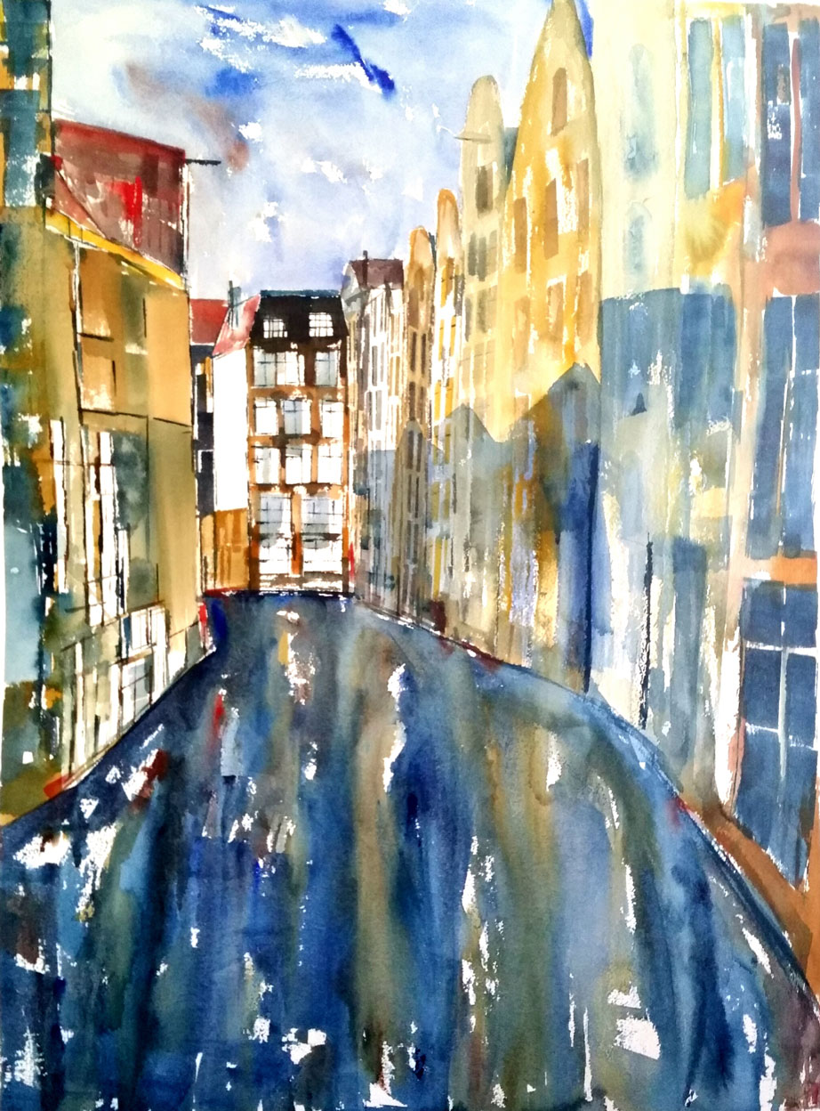 De komende weken exposeert Wim Tromp uit Haarlem zijn aquarellen van stadsgezichten in de sfeerrijke expositieruimte van De Waag aan het Spaarne te Haarlem. Een bewuste keuze van de beeldend kunstenaar: geen landschappen of industriële complexen maar een afgebakend terrein met als thema: “Zicht op de Stad”. Letterlijk soms in bepaalde werken waar te nemen, zoals in een overzicht van Haarlem vanaf het dak van parkeergarage de Kamp. Tromp toont straatbeelden en stadsgezichten van o.m. Haarlem en Amsterdam die sfeerrijk en kleurrijk genoemd kunnen worden. Een schril contrast met de beelden van Aleppo waarbij het skelet van een stad op realistische wijze zichtbaar wordt.